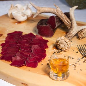 Das Trockenwildfleisch wird durch spezielles Kräutersud- und Reifeverfahren aus Rotwildfleisch vom heimischen Rotwild hergestellt.